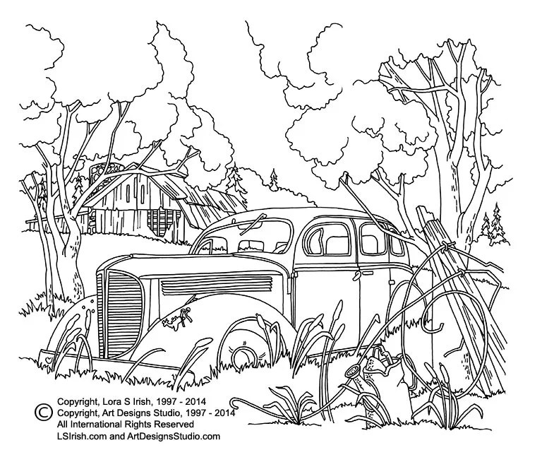 Let’s use the wood burning, Grandpa’s Old Car, as our example of how contrast adds depth to your pyrography designs. Please click of the finished burning and pattern for full sized printable images.