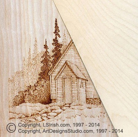 While the two burned images, above, may not seem that dramatic, when I do a side-by-side comparison of the ten-year old Country Church burning against a new, fresh piece of birch plywood you can see it’s not the burning that has faded but the wood that has darkened.