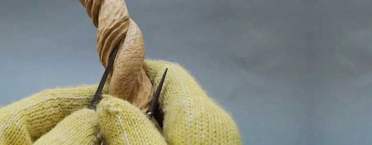 Some of the profile cuts made with my small round gouge were slightly lifted from the snake’s body. To ‘heal’ them I rubbed the wooden handle of my gouge over the snake, moving from the head towards the tail. This light pressure sets the scales back against the wood.
