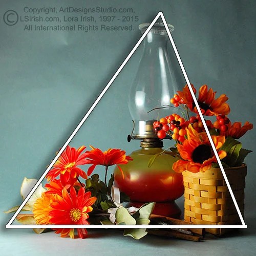 Focal Points – a focal point is the area of the design that first catches your attention. There can be multiple focal points in any design, with one dominate point and other minor points. The focal point of our practice photo is the bright white highlight that falls on the chimney of the lamp. It becomes the focal point because it is the brightest, purest color in the photo, because it falls in the center of the arrangement boundary triangle, and because it falls on top line of the color boundary.