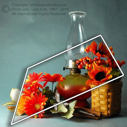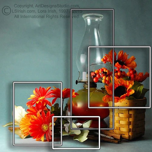 The brightly colored silk daisies grab the attention in the photo and are complimented by the ruby-red base to the antique oil lamp. Shades of golden-yellow are found in the dried leaves, left, the golden orange background daisy, and in the oak basket. Mossy green flows through the central elements of the dried leaves, upper oil lamp base, and in the silk leaves in the basket. Overall this still life has a nice triangular layout with bold dark shadows along the floor of the elements.