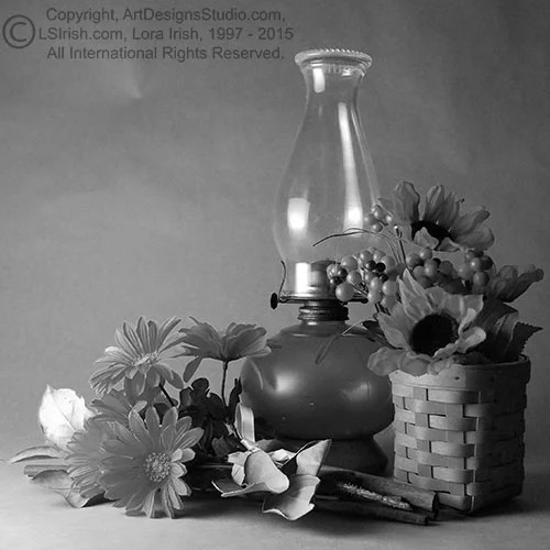 It seems a perfect photo for the base of a pyro project until you gray-scale the image. Suddenly those bright orange and yellow flowers disappear into the background area. What appeared to be a bright highlighted area on the oak basket is now a dull mid-tone value. There are very few white highlights.