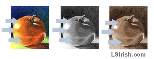 A shade of tonal value will be repeated several times throughout any image or photograph. In the tomato drawing three areas that been marked that all share the same tonal value. Each of these areas would receive the same pyrography burning to keep the tones equal.