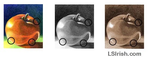 You will find similar or equal tonal values throughout your gray or sepia toned image even though those same areas show different hues in the color photo. A medium green, medium red, and medium blue may share the same medium sepia tonal value.