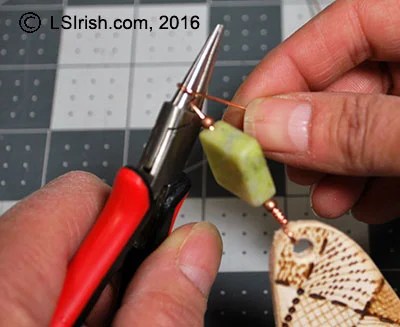 Trace the pattern to your vegetable-dyed leather. Using a loop-tip or ball-tip burning pen, fill in each area with a medium temperature burn. Increase the temperature setting slightly and burn a second layer of strokes to the top half of each area. Increase the temperature again to a hot setting and following the photo burn in the black-toned areas of the design. The round end loop of the turquoise glass bead link is worked through both layers of leather.