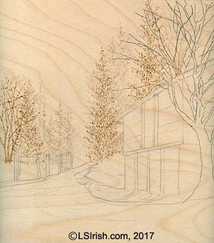 In Pyrography landscape burnings your background determines the time of year, the time of day, and the weather conditions of your scene. Landscapes are worked from the farthest element in the scene to the nearest, foreground elements, which allows you to overlap foreground burnings over the paler background areas. So those first few burning steps are extremely important in setting the stage for your main element, as a barn or church.