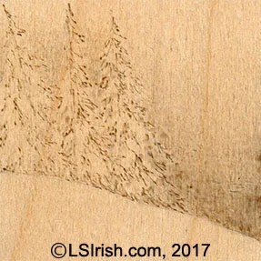 Note in this sample burn that while the tips of the pines are burned at a pale-medium temperature setting, the lowest portions of the pines have little or no burning strokes. The very bottom of the pines are not burned, which implies the heaviest area of fog the lies along the edge of the hill.