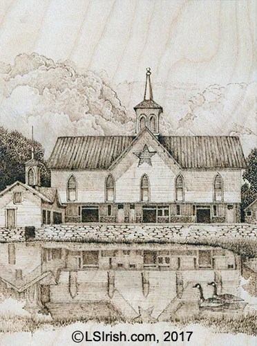 The top edge of the line of background trees has been packed with more burning strokes than the lower layer of the tree area, giving the impression that the leaves are just emerging at the tips of the branches. The high grass – un-mowed – in the foreground shows the new spring growth. Long shadows under the roof overhang are shown on the right side of the face of the church which places the sun in the 2 to 3 o’clock position in the sky.