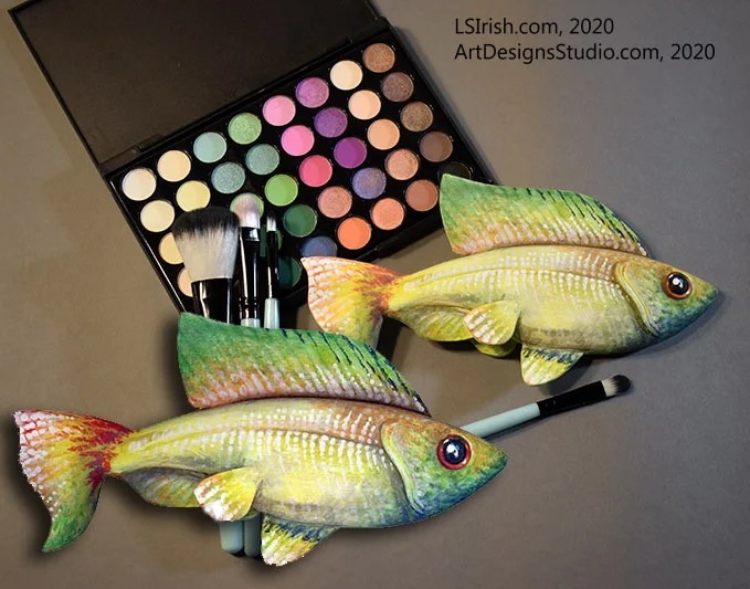 What I have done is applied her great technique to our wood carving, wood burning, and gourd art paintings. Its so simple, but extremely effective. The smaller background fish has just the acrylic paints and the overlay larger fish has been enhanced with eye shadow make up.
