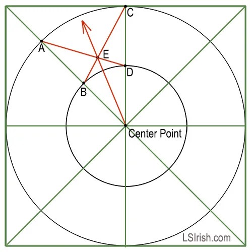 Where these two diagonal lines cross is the center point, “E”, of the top pie shaped section of your grid.