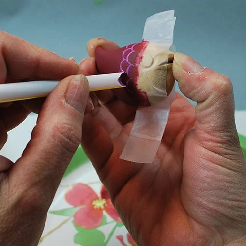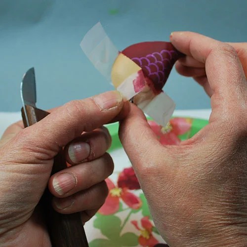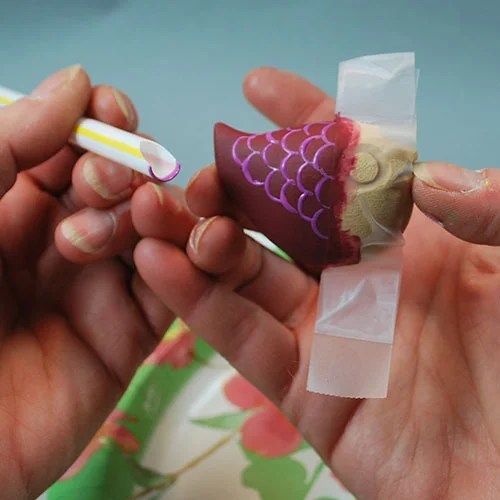 Step 5: To make the fish scales I am going to use that soda straw we had out of the table a while ago. Cut the straw at an angle to remove one-half of the open edge. Place a small amount of pale purple on your palette. Dip the cut edge of the straw into the paint, tap it on the palette, then place the straw end at the highest point on the fish’s back with the open edge of the straw against, or slightly over the tape, press.