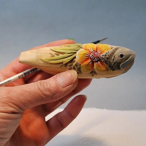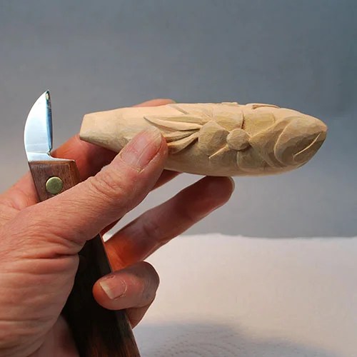 Step 1: Carve your Whittle Fish body using the bench knife. Trace a small floral pattern on each side of the fish, tucking the flower into the gill area, using graphite paper. With your bench knife, v-gouge, and large round gouge create a simple rounded-over edged relief carving.