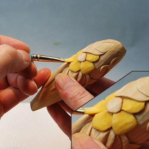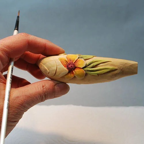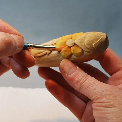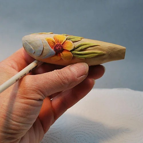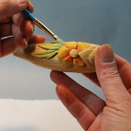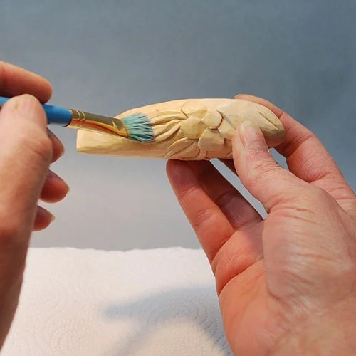 Acrylic craft paint flows across a linseed oiled surface as if they were oil paints themselves. This allows easy blending, thin semi-transparent coloration, and a china-painting style of decoration.