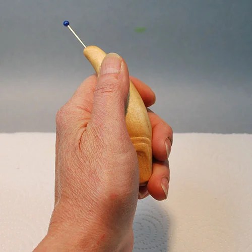 Step 2: Pre-treat the Whittle Fish by burnishing it with a wooden spoon or scrap block of poplar or pine to a bright sheen. Firmly insert a ball-head straight pin in the tail of the body for easy handling.