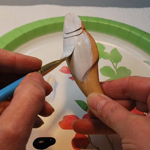 Dampen and blot an old toothbrush with clean water. Load the toothbrush bristles with white. Hold the fish in one hand and pointing the toothbrush towards your carving pull your thumb across the bristles. This will explode a mist of fine dots all over your carving.