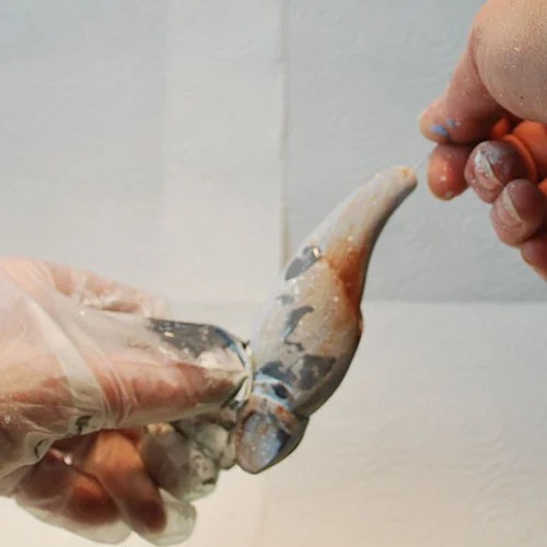 Step 5: To add a few random angular areas of color pull the fingertips of your latex gloves forward a touch, enough to let them wrinkle. Pat your glove-covered fingers in a mix of carbon black and white ( a medium grey tone). Pat on a clean area of your palette. Now grab the fish with those wrinkled, painted coated fingertips.