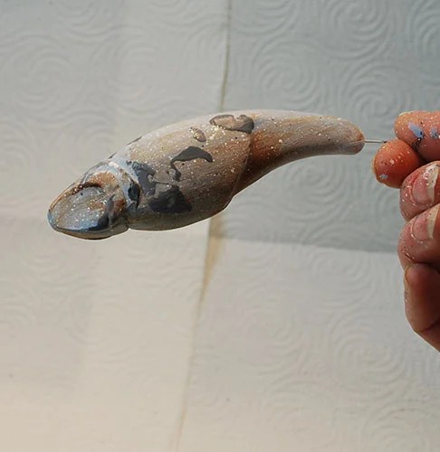 Step 3: Primer coat the body using a multi-colored base coating of titanium white, Wedgewood blue, and nutmeg brown. Note in the photo that the burnished surface allows the smoothest application of your base coat colors that you can get. Set the fish aside to dry well – one half hour or nuke it in two 15 second sessions allowing it to cool between nukings.