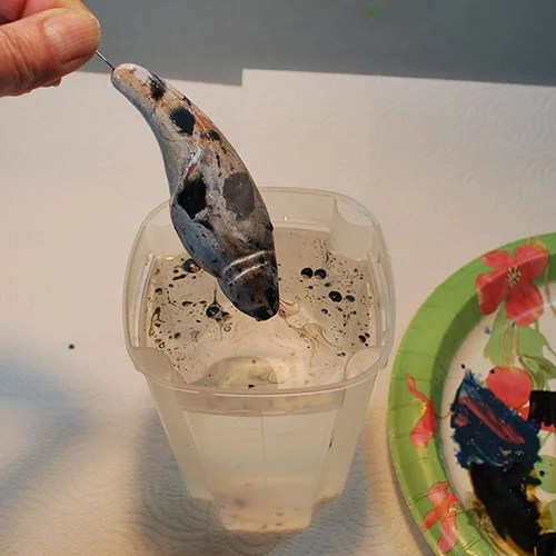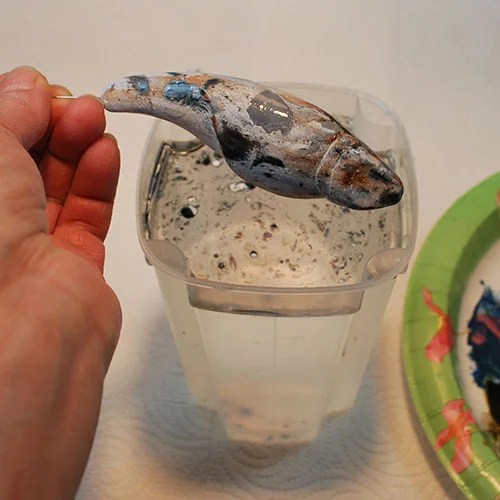 Step 8: Slowly lower your fish into the water container, twisting slowly as you do. Now slowly lift him out of the water. Wah-LA! Instant marble swirls.