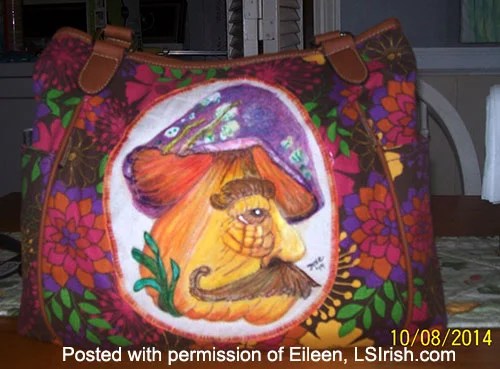 “Thanks so much, I really appreciate that you like it and of course you can post it – I’m attaching my first ever quilt that I’ve made that will be given away this week at church, its not prize worthy but I think it turned out pretty good for my first try. For the mushroom I had to do all acrylic paints cause I couldn’t get my markers to spread – tell you Mom (a long time quilter) not to look to closely -lol-” Eileen