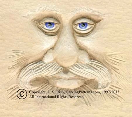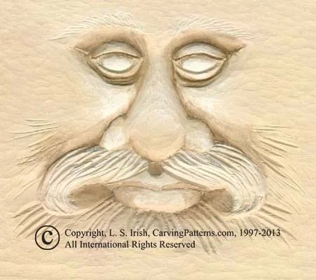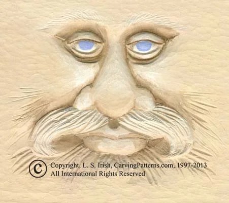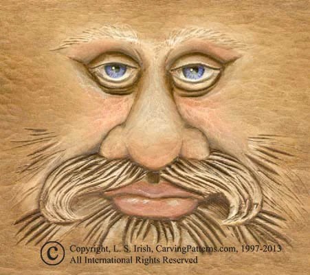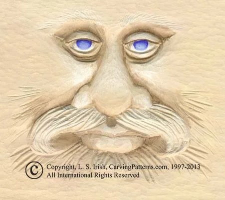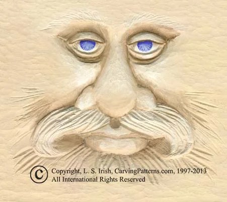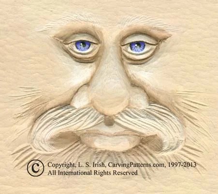 Since this sample was worked on a basswood carving, to complete the work I have allowed the coloring to dry overnight. Two to three light coats of polyurethane or acrylic spray seal is applied to seal the coloring. After the spray sealer had dried completely the wood carving was stained using a medium umber brown. This staining added the last dark shadowing around the half-sphere of the eye ball as well as accents the v-gouge lines in the beard and mustache. When the stain had dried, several days, another light coat of spray sealer was applied.