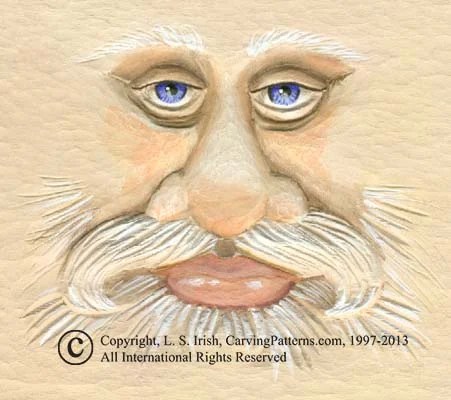 For this tutorial I have created a simple Santa Claus like face carving in a 3/4″ thick by 6″ square basswood board. I have two coats of a base skin color applied. Then I used very thinned burnt umber to shadow the eye lids, along the nose, and under the lower lip. I have also used white to highlight the brow ridge, center point of each eye lid, the nose, cheeks and mustache.