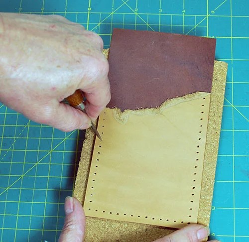 1. Using a ruler and fine point marking pen, mark a stitching hole guide along the seam allowance of your top leather piece to be stitched. For this sample I have marked my holes 1/4″ from the cut edge, with a 1/4″ spacing. Clip the layers of leather to be stitched together with the raw sides (inside) facing. Place your leather layers onto a thick cork board, or 1/2″ thick stack of newspapers. With an awl punch a hole at each of the stitch markings, taking the awl through all of the leather layers.