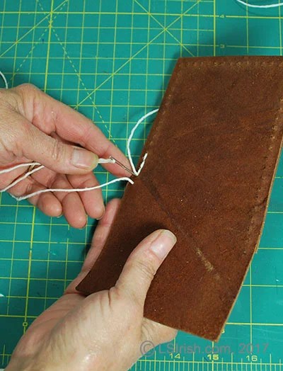 2. Cut a 30 – 36″ length of waxed, nylon thread. Thread one needle on each end of the thread. Pass one needle through the beginning stitching hole, pull the thread through to the center point of the thread. In my sample, my first stitch is worked in the fourth hole from the top of the seam. I will stitch these four holes towards the top of the seam, and then reverse my stitch, working over these holes a second time to anchor or secure the thread.