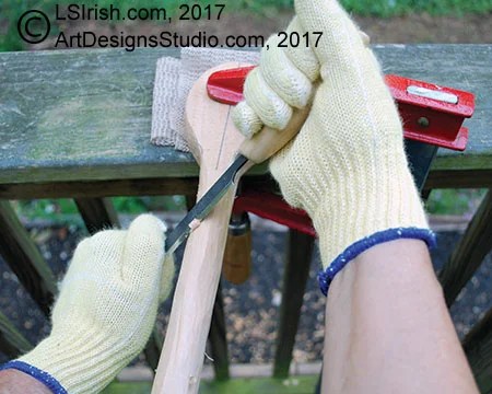 Push strokes can also be made with a draw knife. In the photo, above, a push stroke cuts from the handle area into the handle/bowl curved joint.