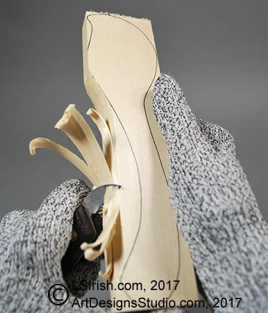The bench knife can be used to cut the general shape of your spoon. Work the cutting edge of the knife with the direction of the wood grain of your basswood blank as much as possible.