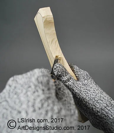 Curves can be cut by first creating a series of push cuts towards the center point of the curve. Reverse the spoon blank in your hand and make a second series of push cuts to release the first.
