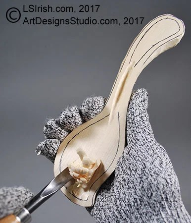 Find and mark the grain direction of your wood blank with a marking pen or dark pencil. Lay your spoon pattern onto the wood aligned with that grain line. A draw knife follows the grain of the wood closely.