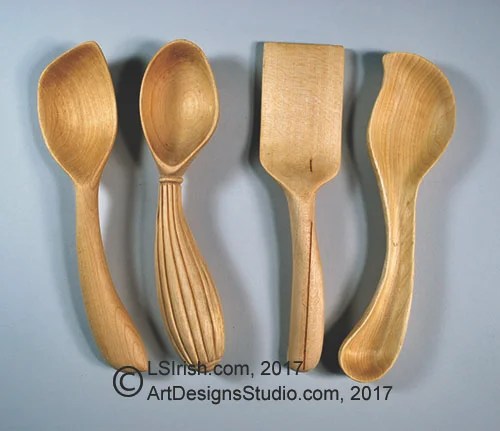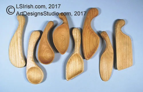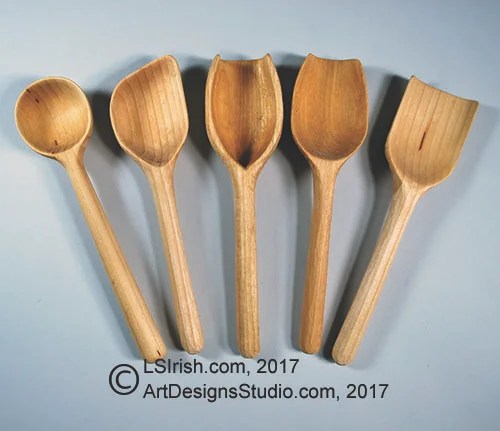 Let’s explore some of the possible carving projects you can work when you take up spoon carving. All of the spoons, forks, knives, scoops, and spatulas patterns shown here are available in Lora S. Irish’s newest book – The Art of Spoon Carving – at Amazon.com.