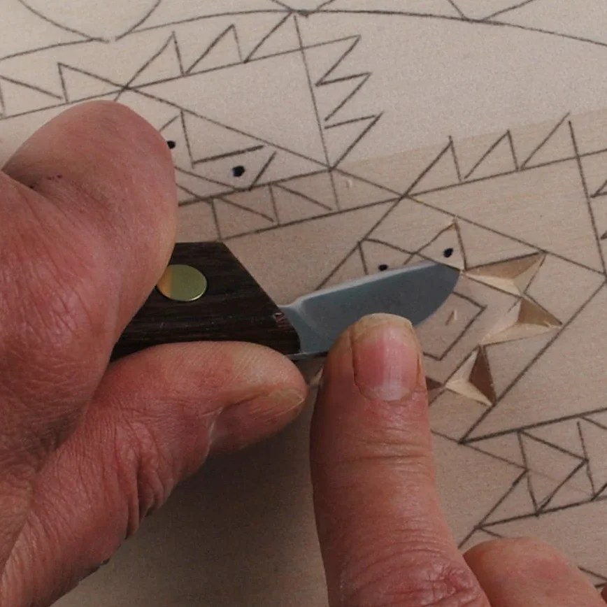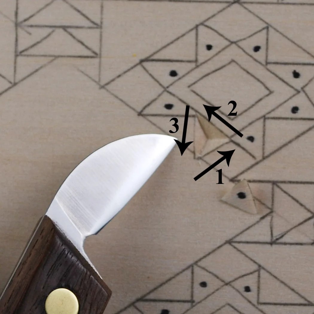This technique is basically created with the chip knife. I highly recommend Moor’s Chip Carving Knives. This set of three are specifically designed for chip carving work and will last you a life time.