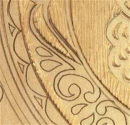 6. Some areas will be too small to v-gouge, these are cut instead with the bench knife or chip knife just as you would a free form chip carving line. Note the semi-circular cuts in the right side of the sample photo. Please see Chip Carving.